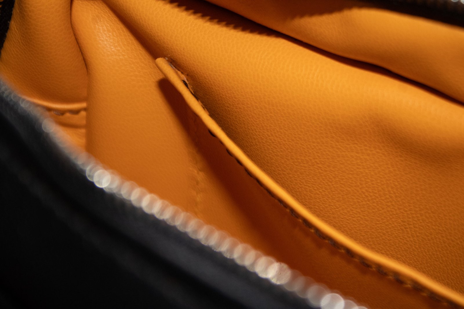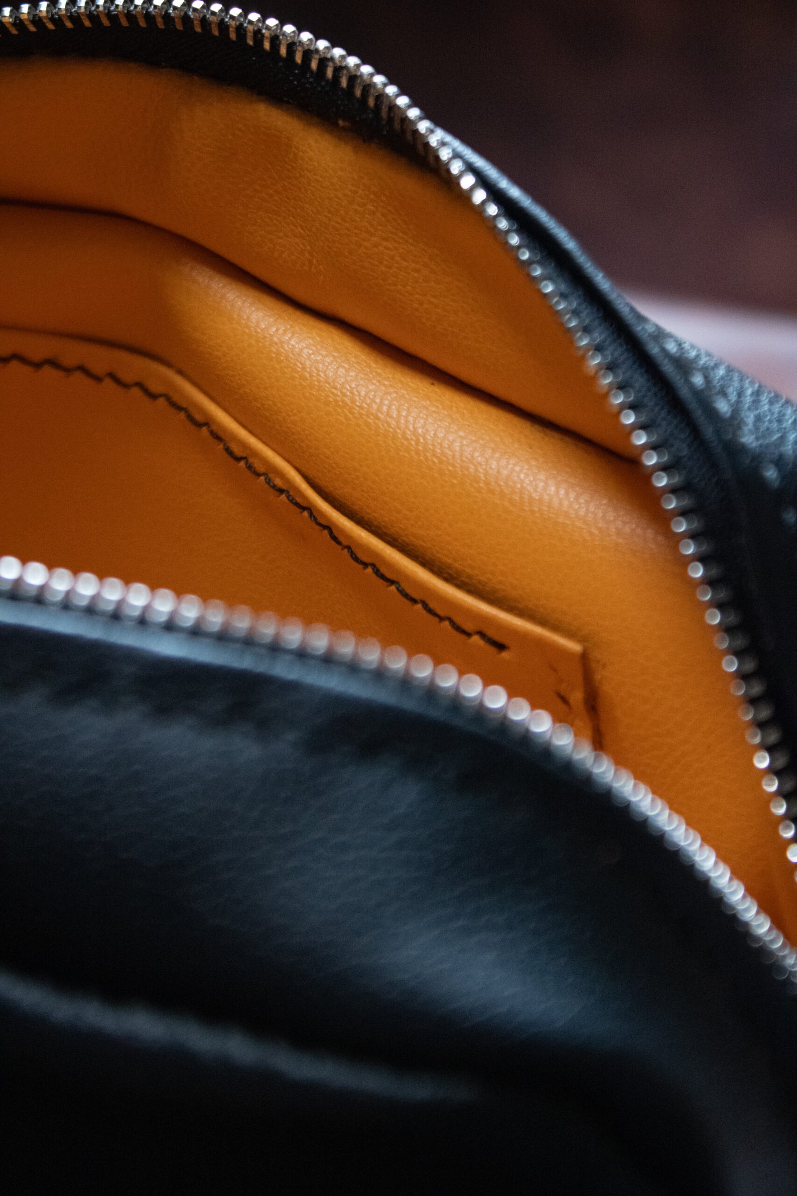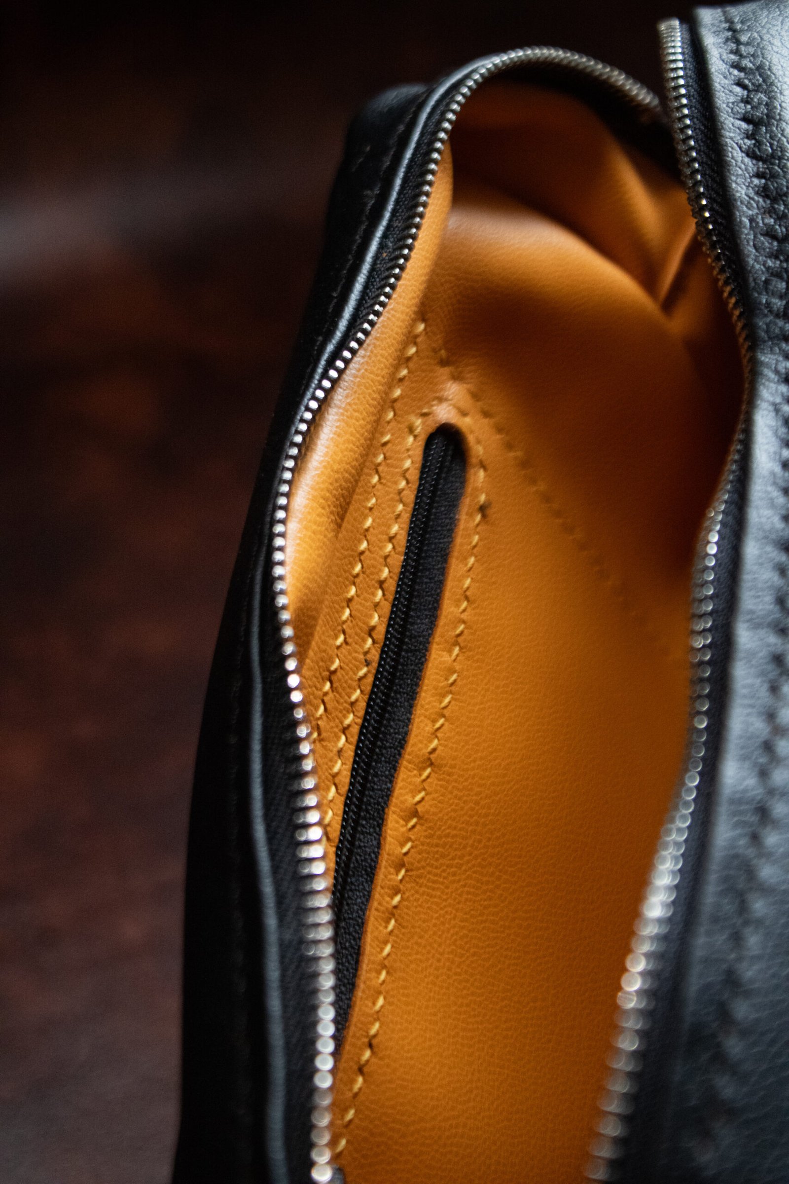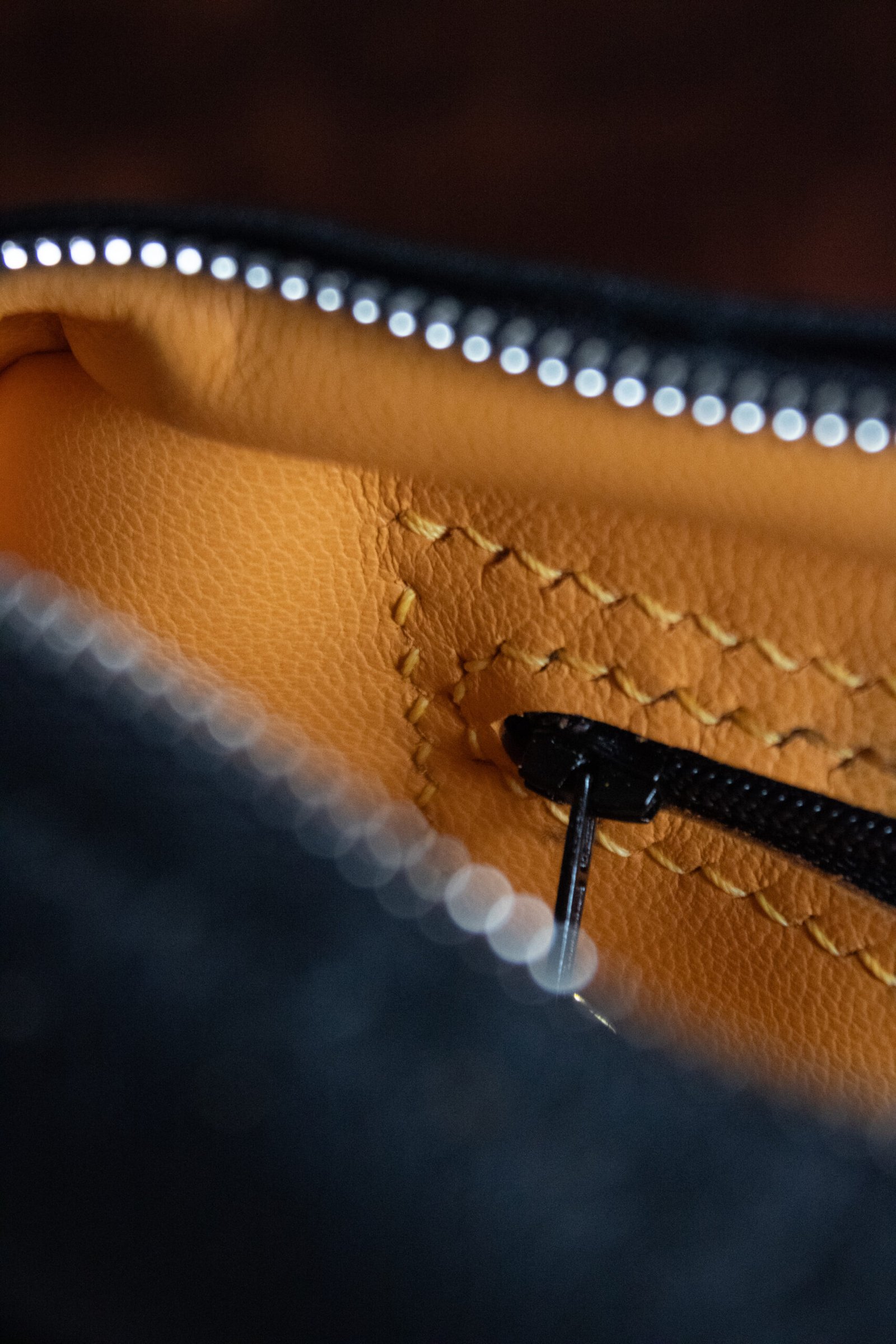 Son ouverture est assurée par une zipper en métal, apportant robustesse et fluidité à l’usage. À l’intérieur, une doublure entièrement intégrée sans couture apparente témoigne d’un travail de finition minutieux.